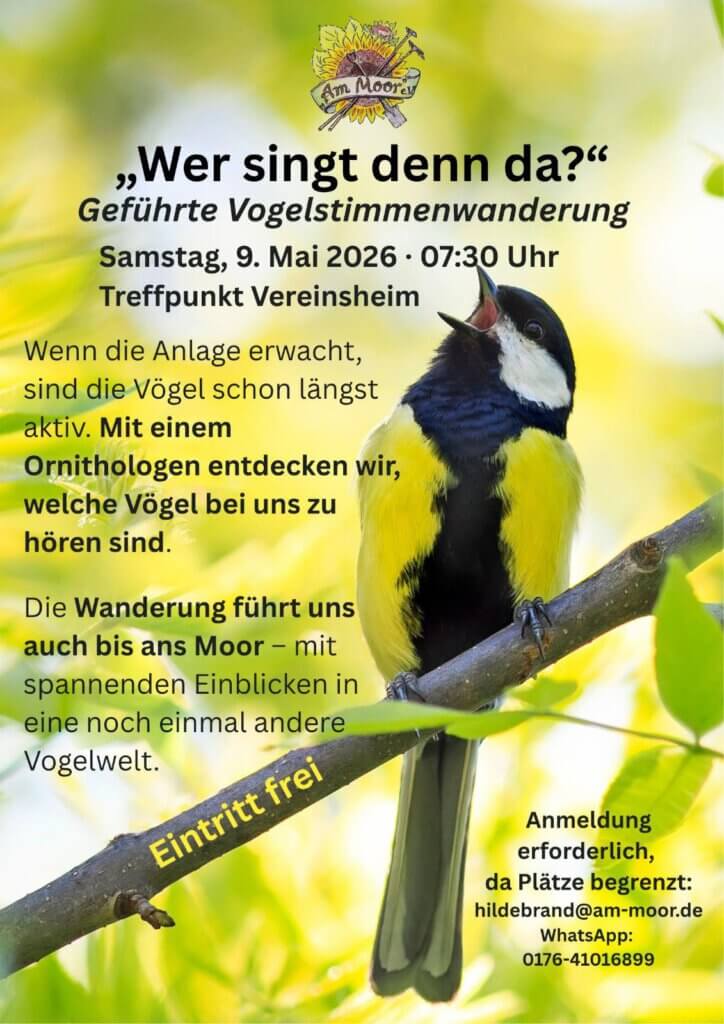 Am Samstag, 9. Mai, startet um 07:30 Uhr eine Vogelstimmenwanderung – gemeinsam mit einem Ornithologen durch unsere schöne Anlage bis ans Moor.