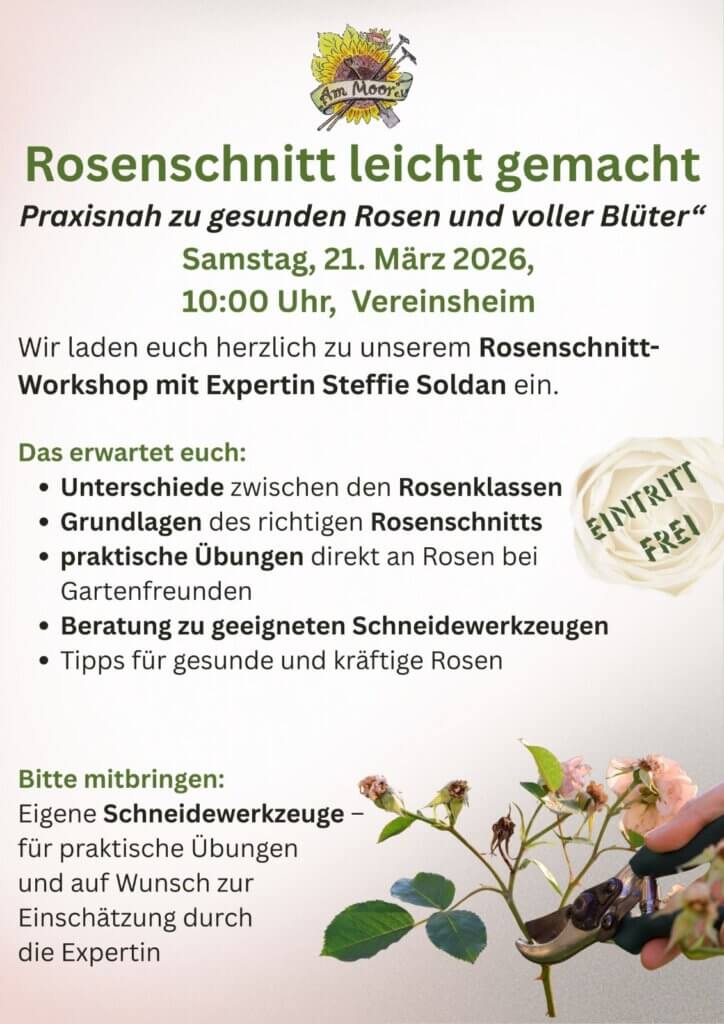 Wir laden euch herzlich zu unserem Rosenschnitt-Workshop am Samstag, den 21. März 2026, von 10:00 bis ca. 12:00 Uhr ins Vereinsheim ein.